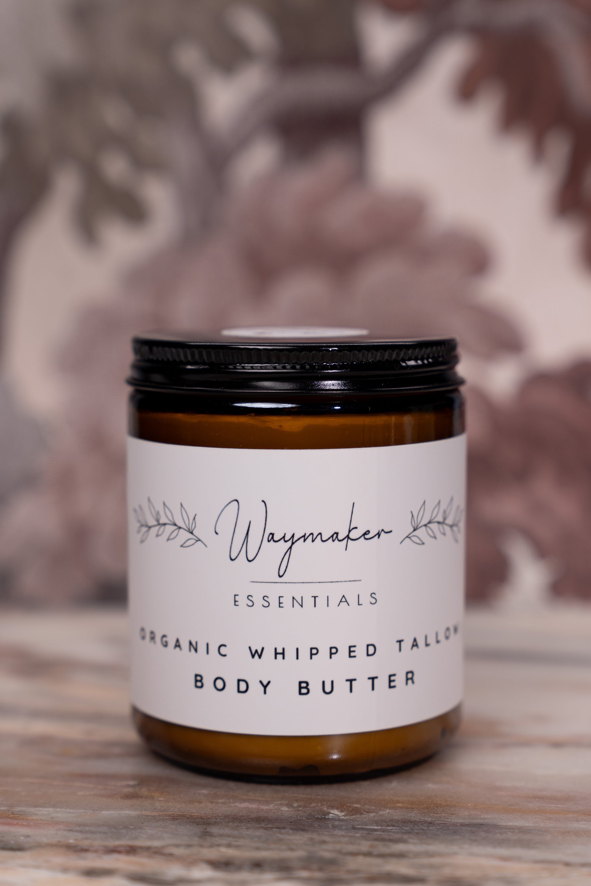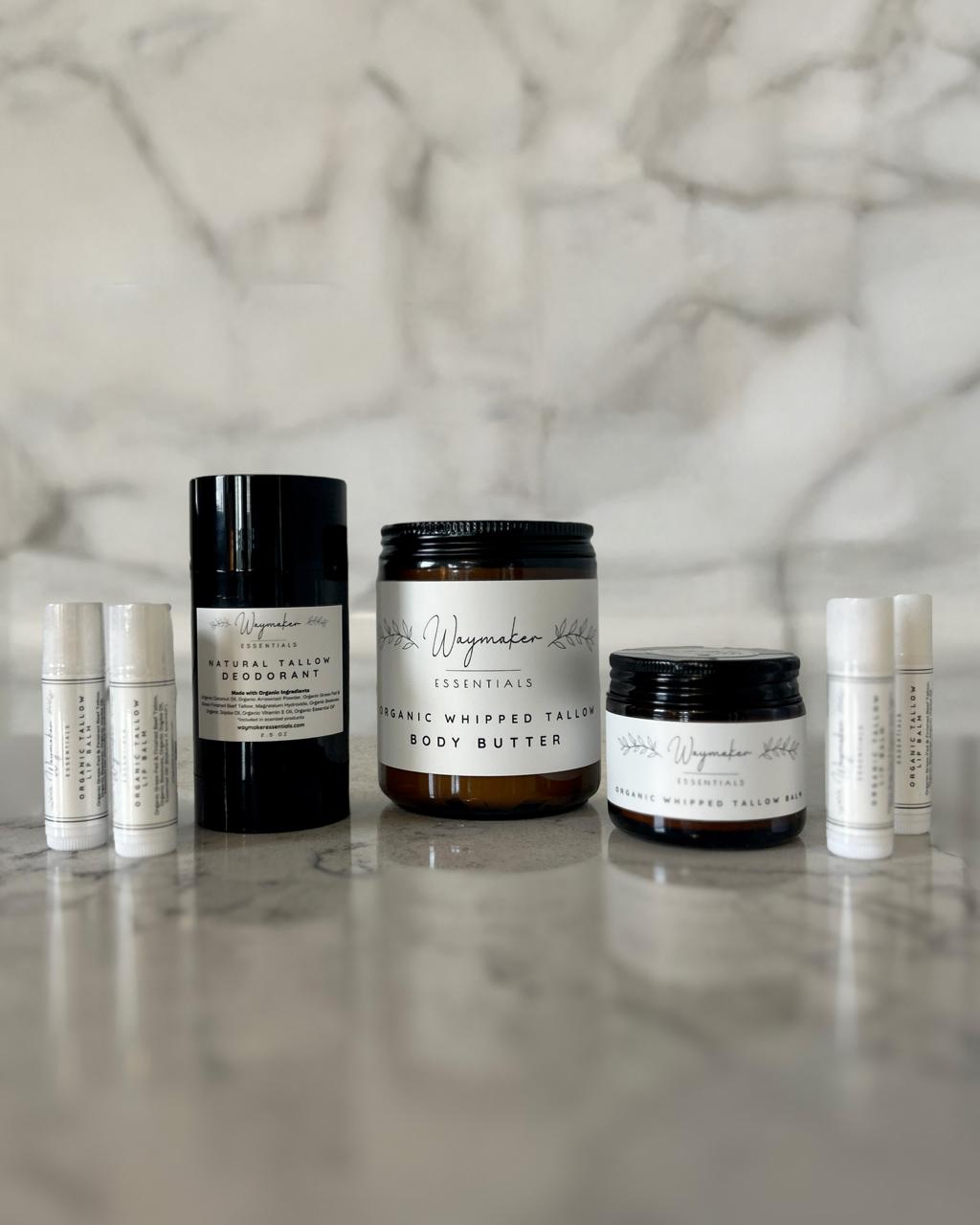 Elevate your entire self-care routine with the Essentials bundle that includes all the necessities for clean and natural beauty: 8oz jar of Organic Whipped Tallow Body Butter, 2oz jar of Organic Whipped Tallow Face Balm, 2.5oz Natural Tallow Deodorant, and 4 Organic Tallow Lip Balms.