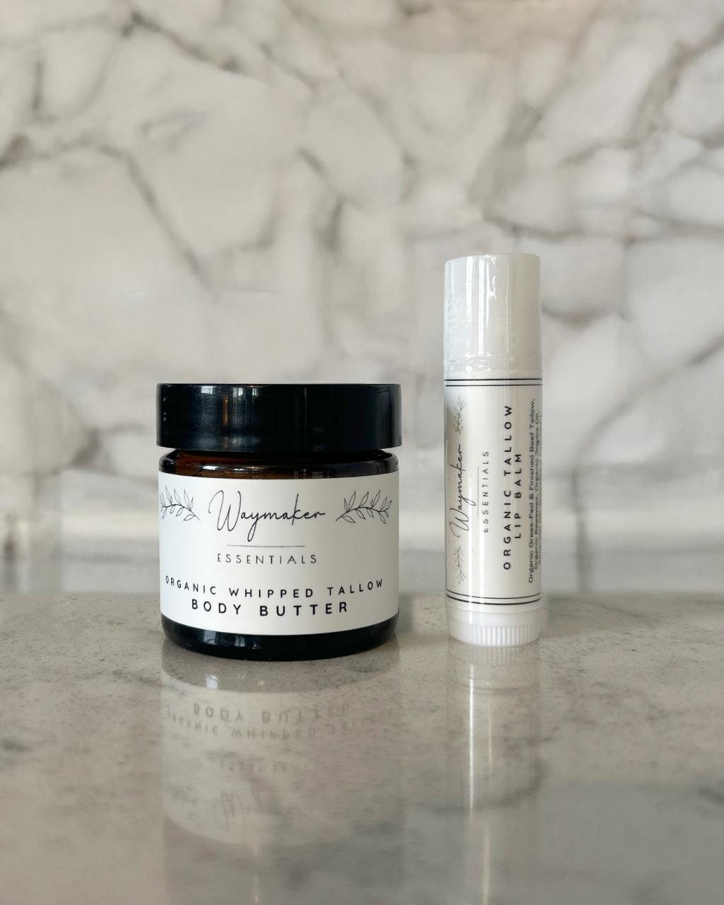 The ultimate versatile bundle, ideal for thoughtful bridesmaid gifts, appreciative teacher presents or your on-the-go essentials. This duo is perfect for pampering & portability. It includes: 1oz jar of Organic Whipped Tallow Body Butter and 1 Organic Tallow Lip Balm.